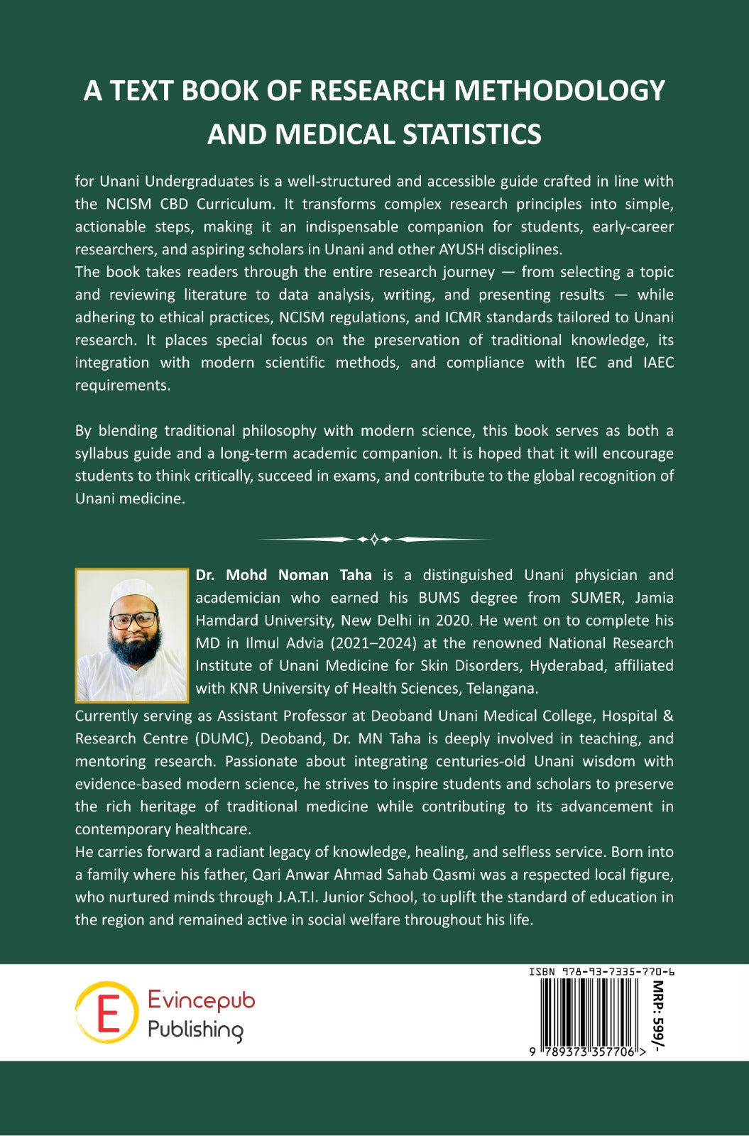 RESEARCH METHODOLOGY AND MEDICAL STATISTICS for Unani Undergraduates is a well-structured and accessible guide crafted in line with the NCISM CBD Curriculum. It transforms complex research principles into simple, actionable steps, making it an indispensable companion for students, early-career researchers, and aspiring scholars in Unani and other AYUSH disciplines.