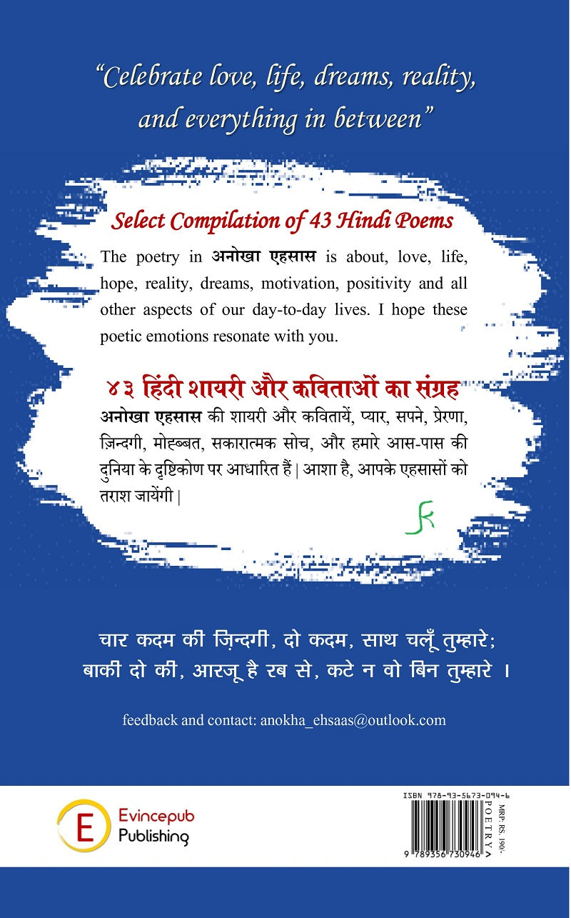 Anokha Ehsaas is a select compilation of Hindi poetry with a sprinkle of Urdu words and supportive meaning/context in English. Anokha Ehsaas celebrates the circle of emotions in our lives & world. It is dedicated to all those individuals who continue to make this world enjoyable through their own unique / anokha views of life.