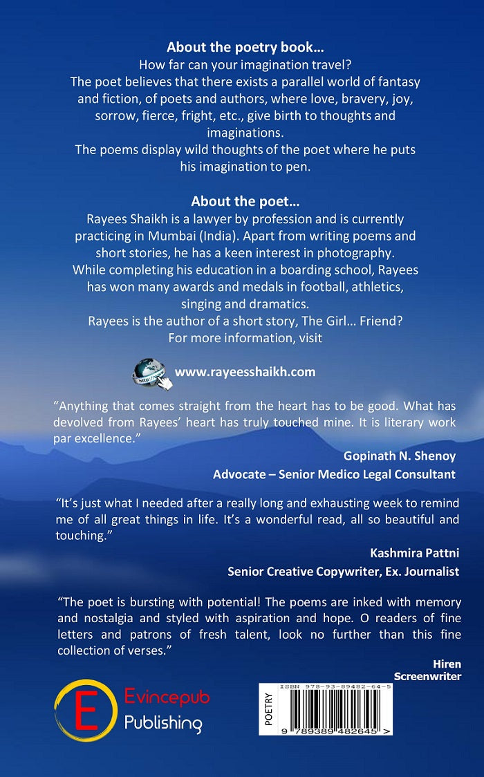 How far can your imagination travel? The poet believes that there exists a parallel world of fantasy and fiction, of poets and authors, where love, bravery, joy, sorrow, fierce, fright, etc, give birth to thoughts and imaginations. The poems display wild thoughts of the poet where he puts his imagination to pen.