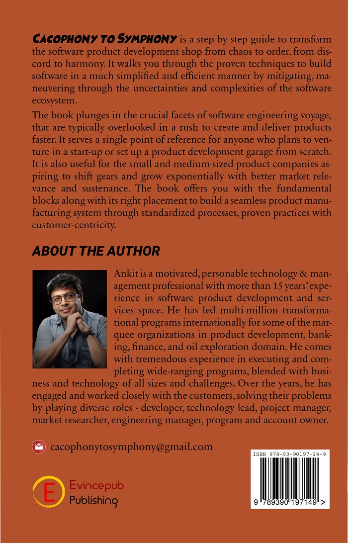 Cacophony to Symphony is a step by step guide to transform the software product development shop from chaos to order, from discord to harmony. It walks you through the proven techniques to build software in a much simplified and efficient manner by mitigating, maneuvering through the uncertainties and complexities of the software ecosystem.