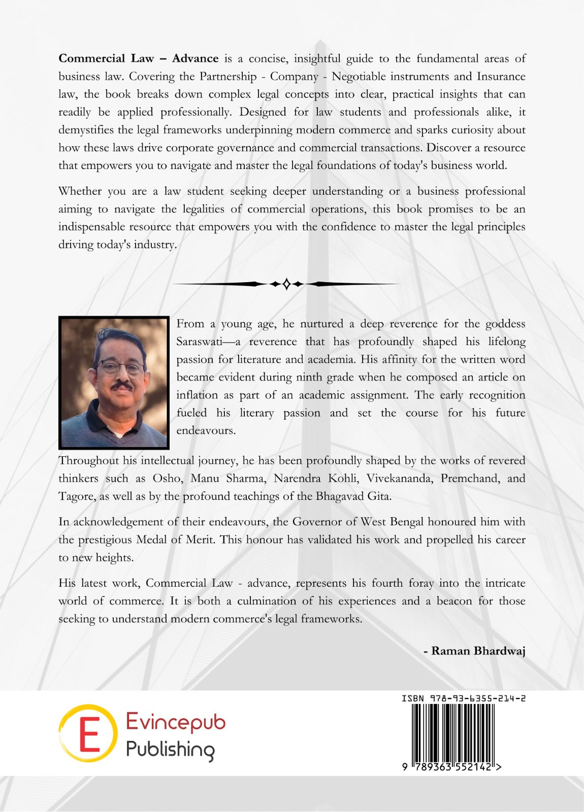 Commercial Law Advance is a concise, insightful guide to the fundamental areas of business law. Covering the Partnership - Company Negotiable instruments and Insurance law, the book breaks down complex legal concepts into clear, practical insights that can readily be applied professionally. Designed for law students and professionals alike, it demystifies the legal frameworks Underpinning modern commerce and sparks curiosity about how these laws drive corporate governance and commercial transactions. Discover a resource that empowers you to navigate and master the legal foundations of today's business world. Whether you are a law student seeking deeper understanding or a business professional aiming to navigate the legalities of commercial operations, this book promises to be an indispensable resource that empowers you with the confidence to master the legal principles driving today's industry.