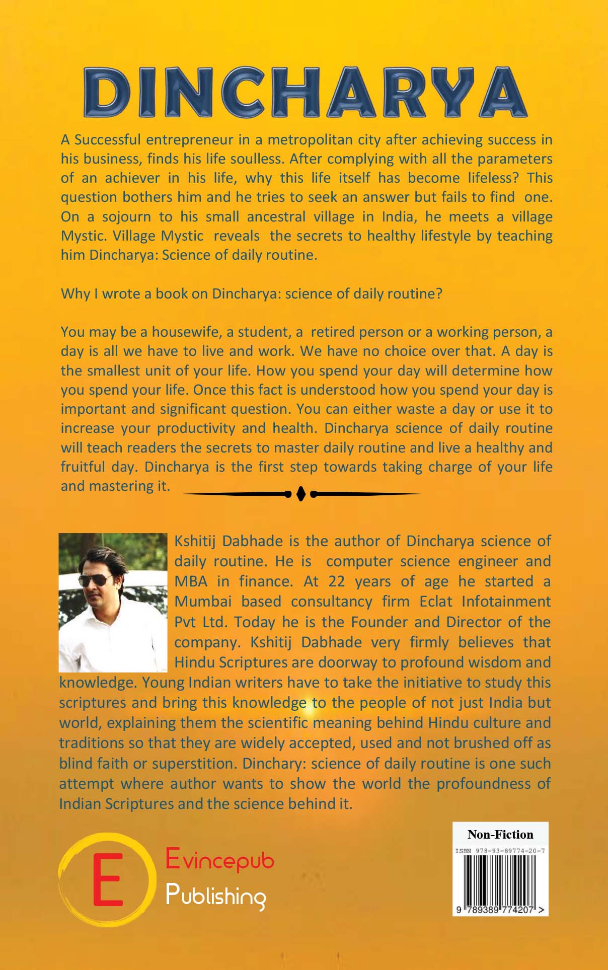 Kshitij Dabhade has completed his B.E in Computer Science and MBA (Finance)from Mumbai University. At 22 years of age he started a Mumbai based consultancy firm Eclat Infotainment Pvt Ltd. Today he is the Founder and Director the company. Kshitij Dabhade very firmly believes that Hindu Scriptures are doorway to profound wisdom and knowledge. Young Indian writers have to take the initiative to study this scriptures and bring this knowledge to the younger generation of not just India but world, explaining the younger generation the scientific meaning behind Hindu culture and tradition so that they are widely accepted and used and not brushed off as blind faith or superstition. Dinchary:science of daily routine is one such attempt where author wants to show the world the profoundness of Indian Scriptures and the science behind it.
