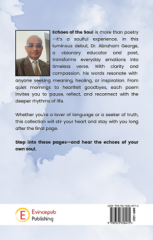 Echoes of the Soul" is more than a collection of poems — it is a quiet unfolding of the human spirit. With clarity and compassion, Dr. Abraham George explores the tender spaces of our inner world: love and loss, hope and sorrow, time and memory.