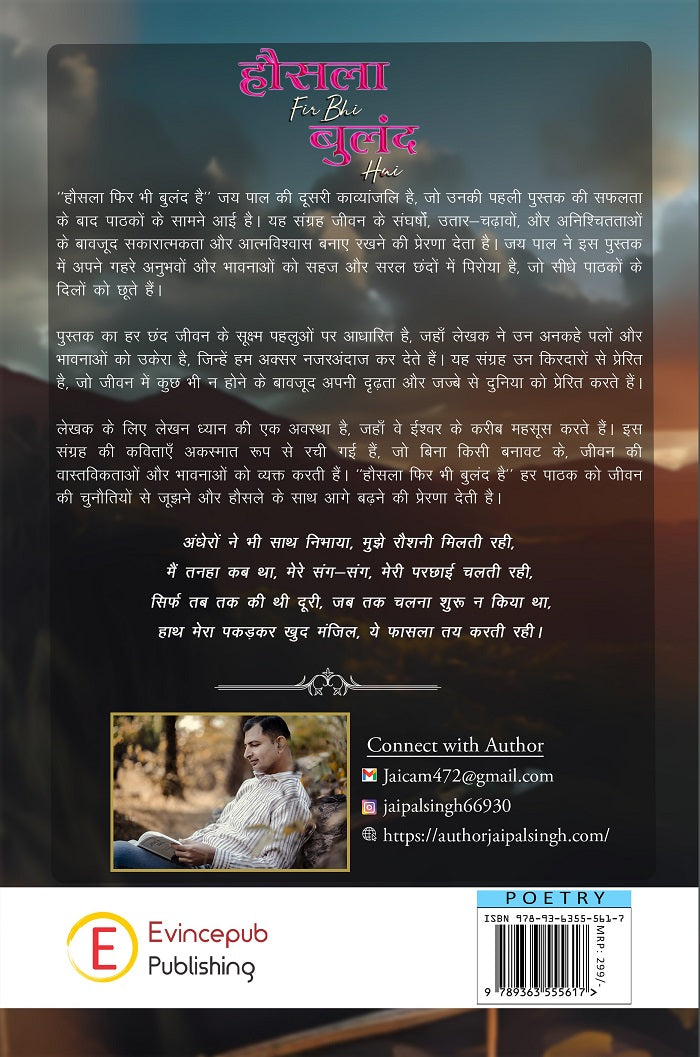 Hausla Fir Bhi Buland Hai by Jai Pal Singh is a heartfelt poetry collection that celebrates resilience amidst life’s struggles. Through simple yet profound verses, the book inspires positivity and courage. It captures unspoken emotions, real-life challenges, and the indomitable human spirit, offering readers motivation to overcome obstacles with hope and strength.