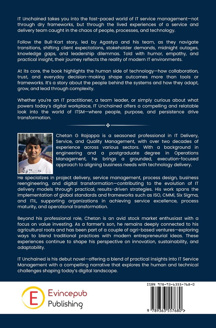 Written with heart, humor, and technical wisdom, IT UnCHaiNed follows the fictional yet deeply familiar world of Bull-Kart—an enterprise wrestling with legacy baggage, cultural resistance, and modern transformation demands. The book’s protagonist, Agastya Raj, is not your typical hero—he's an accidental change-maker, navigating burnout, chaos, sabotage, and a growing sense of purpose as he learns to lead with empathy and evolve from survival to strategy.