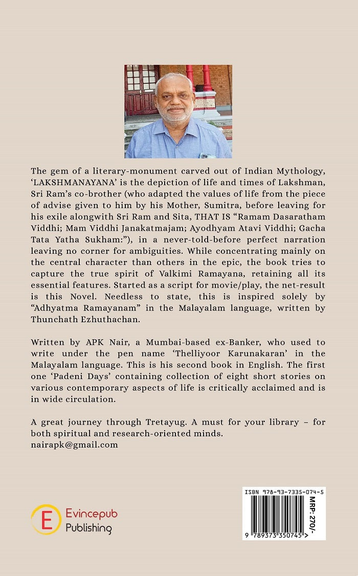 ‘LAKSHMANAYANA’ is an insight into the life and times of one of the most powerful characters found in Indian Mythology, Lakshman, the co-brother of Sri Ram. The never-told-before perfect narration leaves no corner for ambiguities. While concentrating mainly on the central character than others in the epic, the book tries to capture the true spirit of Valkimi Ramayana, retaining all its essential features.