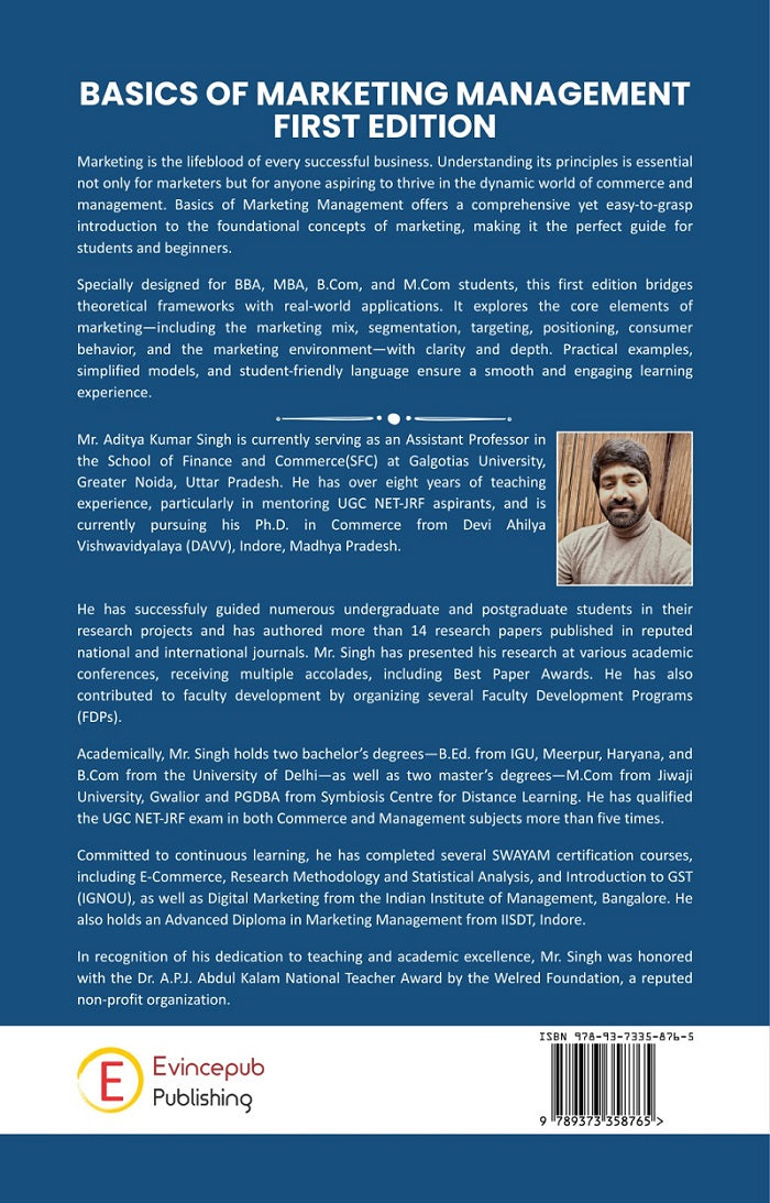 Specially designed for BBA, MBA, B.Com, and M.Com students, this first edition bridges theoretical frameworks with real-world applications. It explores the core elements of marketing-including the marketing mix, segmentation, targeting, positioning, consumer behavior, and the marketing environment-with clarity and depth. Practical examples, simplified models, and student-friendly language ensure a smooth and engaging learning experience.