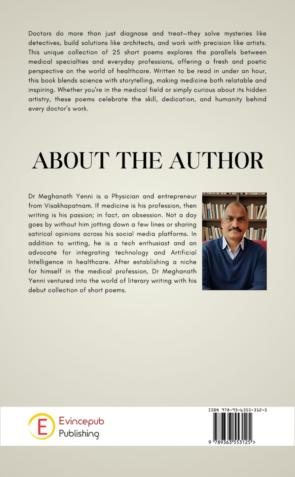 Doctors do more than just diagnose and treat—they solve mysteries like detectives, build solutions like architects, and work with precision like artists. This unique collection of 25 short poems explores the parallels between medical specialties and everyday professions, offering a fresh and poetic perspective on the world of healthcare. Written to be read in under an hour, this book blends science with storytelling, making medicine both relatable and inspiring. Whether you're in the medical field or simply curious about its hidden artistry, these poems celebrate the skill, dedication, and humanity behind every doctor’s work.