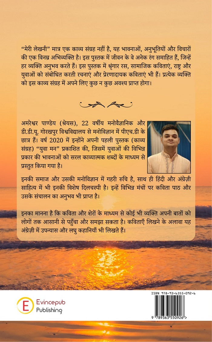 "Meri Lekhni" is a collection of poems in which many emotions have been presented. This collection of poems has prayers for God and poems that mention social relationships, full of different types of emotions and rhymes, and is also a collection of thoughts arising in the human mind. Shringar Rasa has been presented with its full dignity. Poetic discussions related to nation, society and environmental issues are also depicted in this book. It also contains encouraging poems that boost courage and hope.