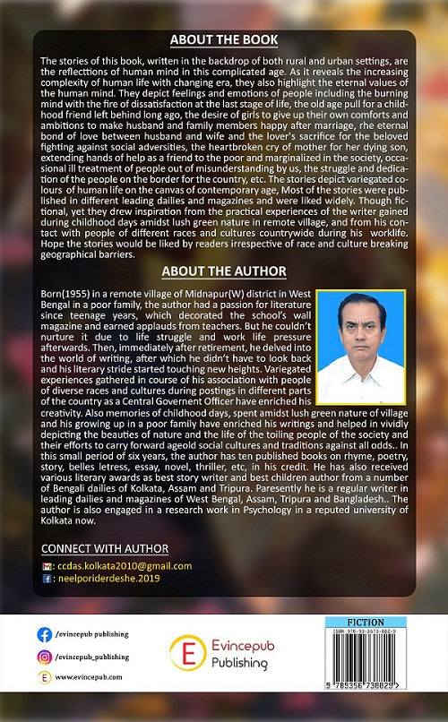 The stories of this book, written in the backdrop of both rural and urban settings, are the reflecttions of human mind in this complicated age. As it reveals the increasing complexity of human life with changing era, they also highlight the eternal values of the human mind. They depict feelings and emotions of people including the burning mind with the fire of dissatisfaction at the last stage of life, the old age pull for a childhood friend left behind long ago, the desire of girls to give up their own comforts and ambitions to make husband and family members happy after marriage, the eternal bond of love between husband and wife and the lover's sacrifice for the beloved fighting against social adversaries, the heartbroken cry of mother for her dying son, people’s extending hands of help as a friend to the poor and marginalized in the society, occasional ill treatment of people out of misunderstanding by us, the struggle and dedication of the people on the border for the country, etc. The stories depict variegated colours of human life on the canvas of contemporary age,