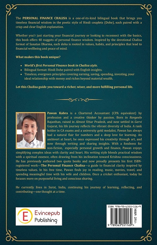 Whether you're just starting your financial journey or looking to reconnect with the basics, this book offers 40 nuggets of personal finance wisdom. Inspired by the devotional Chalisa format of Sanatan Dharma, each doha is rooted in values, habits, and principles that lead to financial wellbeing and peace of mind.