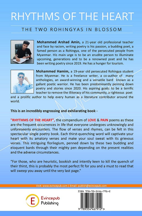 This is an incredibly engrossing and exhilarating book – "RHYTHMS OF THE HEART", the compendium of LOVE & PAIN poems as these are the frequent occurrences in life that everyone undergoes unknowingly and unforeseenly encounters. The flow of verses and rhymes, can be felt in this spectacular single poetry book. Each thirst-quenching word will captivate your heart with its amatory verses and make your soul sweat with its grievous verses. This intriguing florilegium, penned down by these two budding and eloquent bards through their mighty pen depending on the present realities and the adverse circumstances. “For those, who are heuristic, bookish and intently keen to kill the quench of their thirst, this is probably the most perfect fit for you and a must to read that will sweep you away until the very last page.”