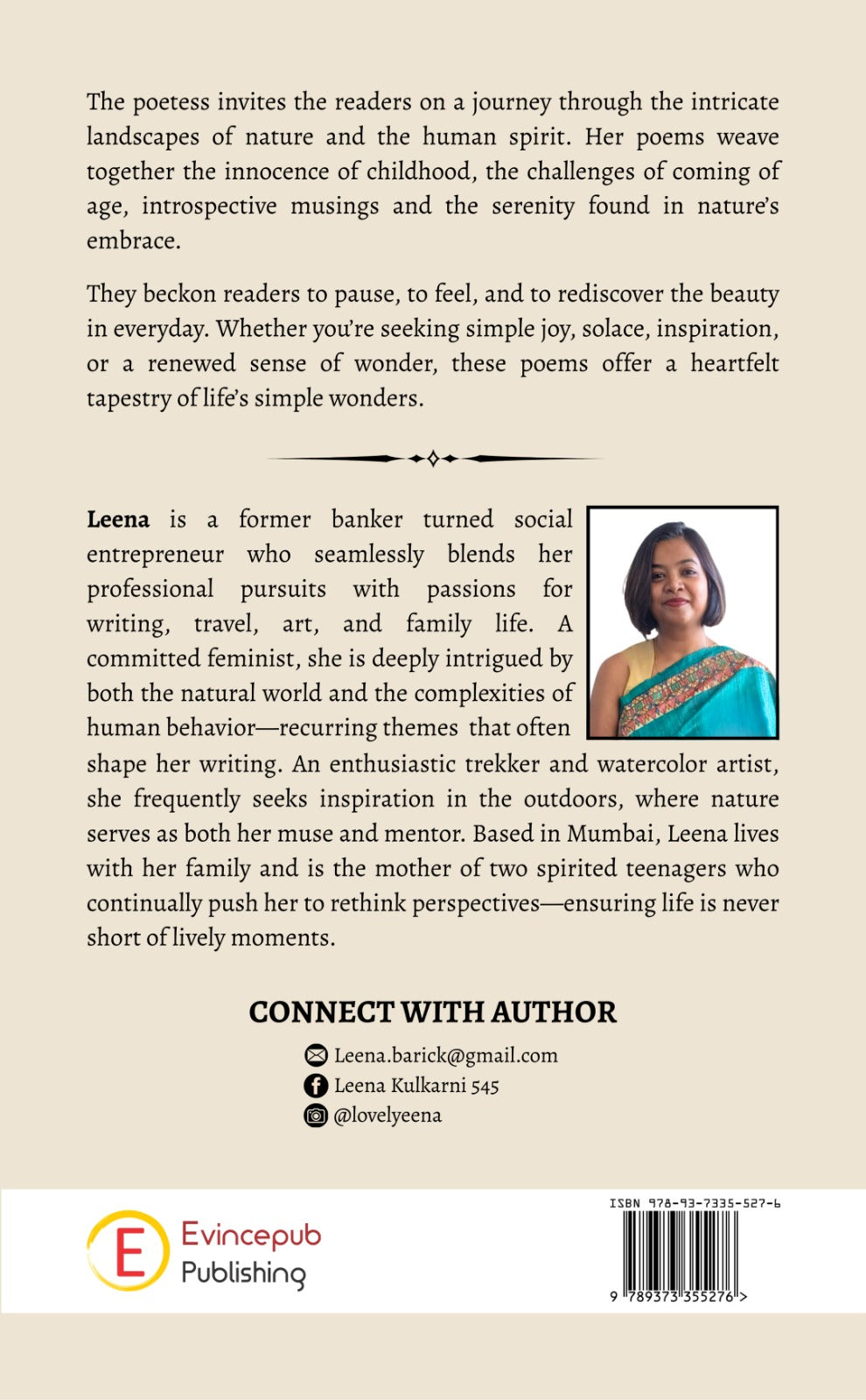 This heartfelt collection of poems offers a glimpse into the author’s relationships—with herself, with others, and with the world around her. Drawing inspiration from childhood memories, the journey of coming of age, and the serenity found in nature's embrace, her verses offer a heartfelt reflection on personal growth and discovery. Woven through each verse is the joy, wonder and growth she finds through her relationships and travels. Through vivid imagery and introspective verses, the collection celebrates the enriching experiences that shape our lives and the profound beauty discovered in nature's embrace.