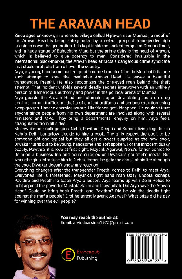 THE ARAVAN HEAD Since ages unknown, in a remote village called Hijravan near Mumbai, a motif of the Aravan Head is being safeguarded by a select group of transgender high priestess down the generation. It is kept inside an ancient temple of Draupadi cult, with a huge statue of Bahuchara Mata but the prime deity is the head of Aravan, which is believed to give potency to men. Considered invaluable in the international black-market, the Aravan head attracts a dangerous crime syndicate that steals artifacts from all over the country. Arya, a young, handsome and enigmatic crime branch officer in Mumbai foils one such attempt to steal the invaluable Aravan Head. He saves a beautiful transgender, Preethi. He also recognizes the one-eyed man behind the theft attempt. That incident unfolds several deadly secrets interwoven with an unlikely person of tremendous authority and power in the political arena of Mumbai. Arya guards the Aravan Head and stumbles upon devastating facts on drug dealing, human trafficking, thefts of ancient artifacts and serious extortion using swap groups. Unseen enemies sprout. His friends get kidnapped. He couldn’t trust anyone since people from his own department are involved along with several ministers and MPs. They bring a departmental enquiry on him. Arya feels strangulated from all sides. Meanwhile four college girls, Neha, Pavithra, Deepti and Suhani, living together in Neha’s Delhi bungalow, decide to hire a cook. The girls expect the cook to be someone old and typical but they all get a sweet surprise as the new cook, Diwakar, turns out to be young, handsome and soft spoken. For the innocent dusky beauty, Pavithra, it is love at first sight. Mayank Agarwal, Neha’s father, comes to Delhi on a business trip and pours eulogies on Diwakar’s gourmet’s meals. But when the girls introduce him to Neha’s father, he gets the shock of his life although the cook Diwakar doesn’t show any reaction. Everything changes after the transgender Preethi comes to Delhi to meet Arya. Everyone’s life is threatened. Mayank’s right hand man Uday Chopra kidnaps Pavithra and Preethi to teach Arya a lesson. Arya teams up with Delhi Police to fight against the powerful Mustafa Salim and Inayatullah. Did Arya save the Aravan Head? Could he bring back Preethi and Pavithra? Did he win the deadly fight against the mafia people? Did he arrest Mayank Agarwal? What prize did he pay for winning over the evil people?