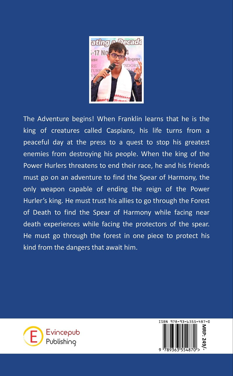 The adventure begins! When Franklin learns that he is the king of creatures called Caspians, his life turns from a peaceful day at the press to a quest to stop his greatest enemies from destroying his people. When the king of the Power Hurlers threatens to end their race, he and his friends must go on an adventure to find the Spear of Harmony, the only weapon capable of ending the reign of the Power Hurler’s king. He must trust his allies to go through the Forest of Death to find the Spear of Harmony while facing near-death experiences while facing the protectors of the spear. He must go through the forest in one piece to protect his kind from the dangers that await him.