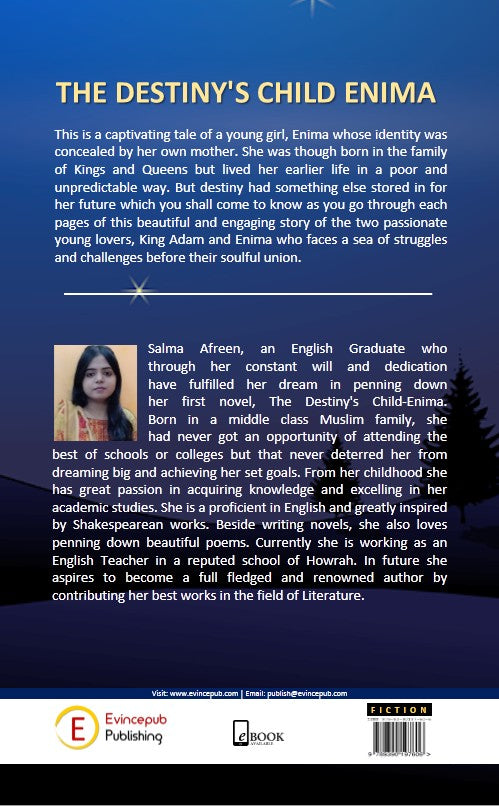 The book, The Destiny's Child-Enima that I have written is meant for all people. I mean both the younger and the older generations can enjoy reading it. It is completely an engaging story which will take you into the life of the protagonist, Enima, the young girl who though was born in the royal dynasty but lived her early life in a poor and unpredictable way. But Enima was such a hardworking girl that she never led her miseries overtake her happiness. She was blessed not only with divine beauty but also great intelligence and grace. As you will read this romantic tale, you will not only enjoy the striking love that develops between the two main characters, King Adam and Enima but also the major twists and turns that happens in their lives when Enima's step brother, Prince William unknowingly falls in love with her. He goes all hysteric and desperate in achieving the girl he loved most. But later when he realizes that Enima was his step sister, he and his father, King Alex becomes thirsty for her blood. Now here the story takes a drastic turn and the mystery develops which will be carried throughout the novel until you finish reading it.