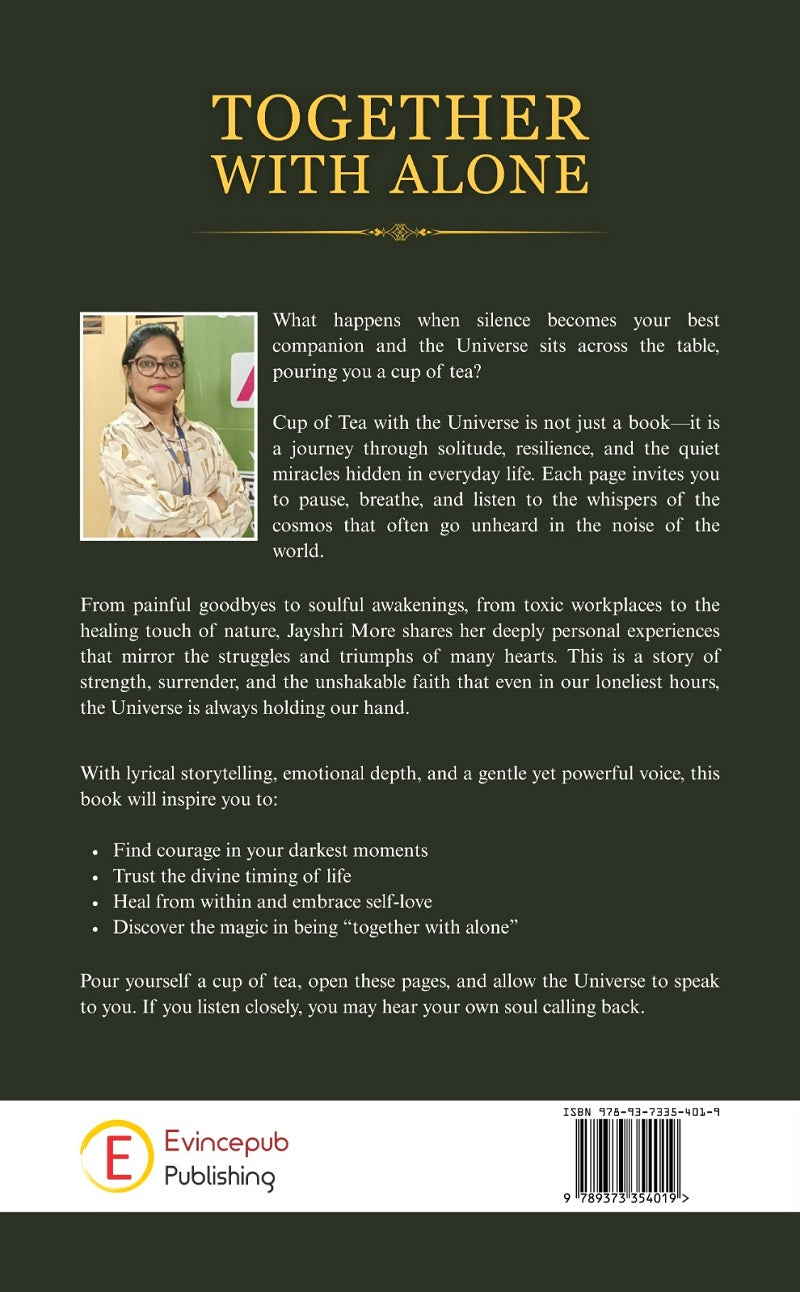 “Together With Alone: A Cup of Tea with the Universe” is a soul-stirring memoir that walks the delicate path between solitude and self-discovery. In this deeply personal journey, Jayshri More invites readers into the quiet corners of her heart, where moments of loneliness become conversations with the divine, and life’s storms give birth to resilience and hope.