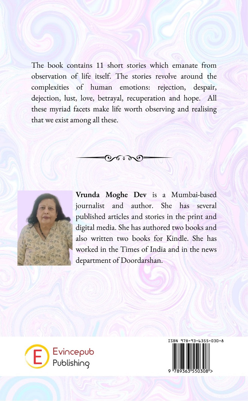 The book contains 11 short stories which emanate from observation of life itself. The stories revolve around the complexities of human emotions: rejection, despair, dejection, lust, love, betrayal, recuperation and hope. All these myriad facets make life worth observing and realising that we exist among all these.