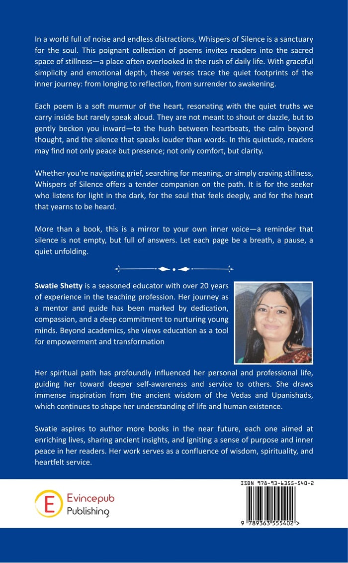 Each poem is a soft murmur of the heart, resonating with the quiet truths we carry inside but rarely speak aloud. They are not meant to shout or dazzle, but to gently beckon you inward—to the hush between heartbeats, the calm beyond thought, and the silence that speaks louder than words. In this quietude, readers may find not only peace but presence; not only comfort, but clarity.